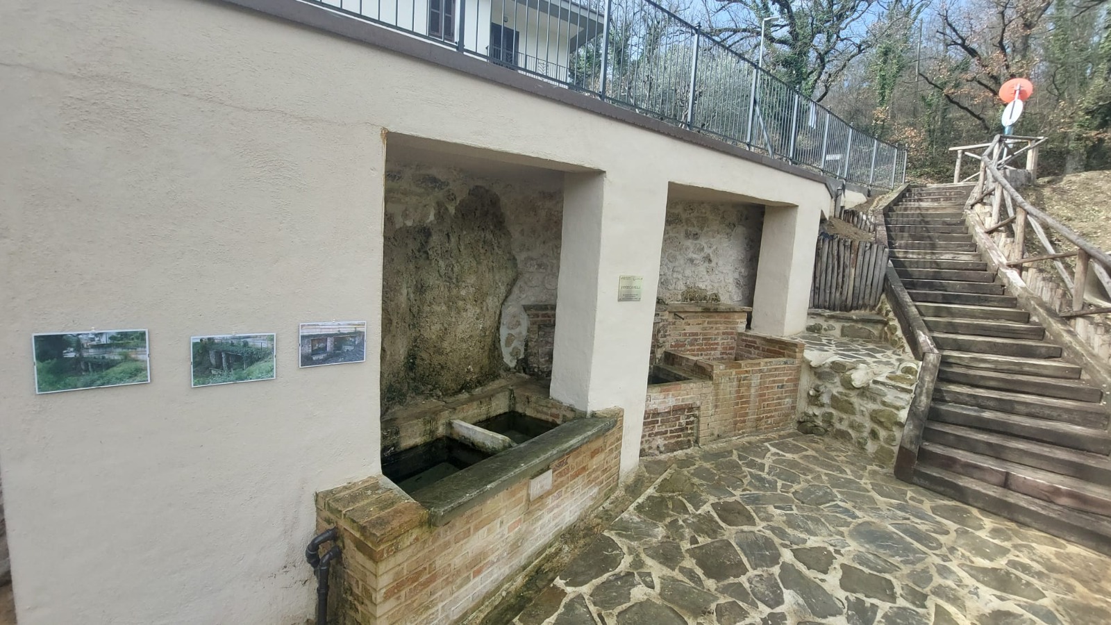 l’idrolavaggio delle superfici murarie deteriorate dagli agenti atmosferici e la pulizia delle vasche. Realizzati i gradoni per la discesa alla fonte e la pavimentazione della parte anteriore. Per la sicurezza di coloro che si