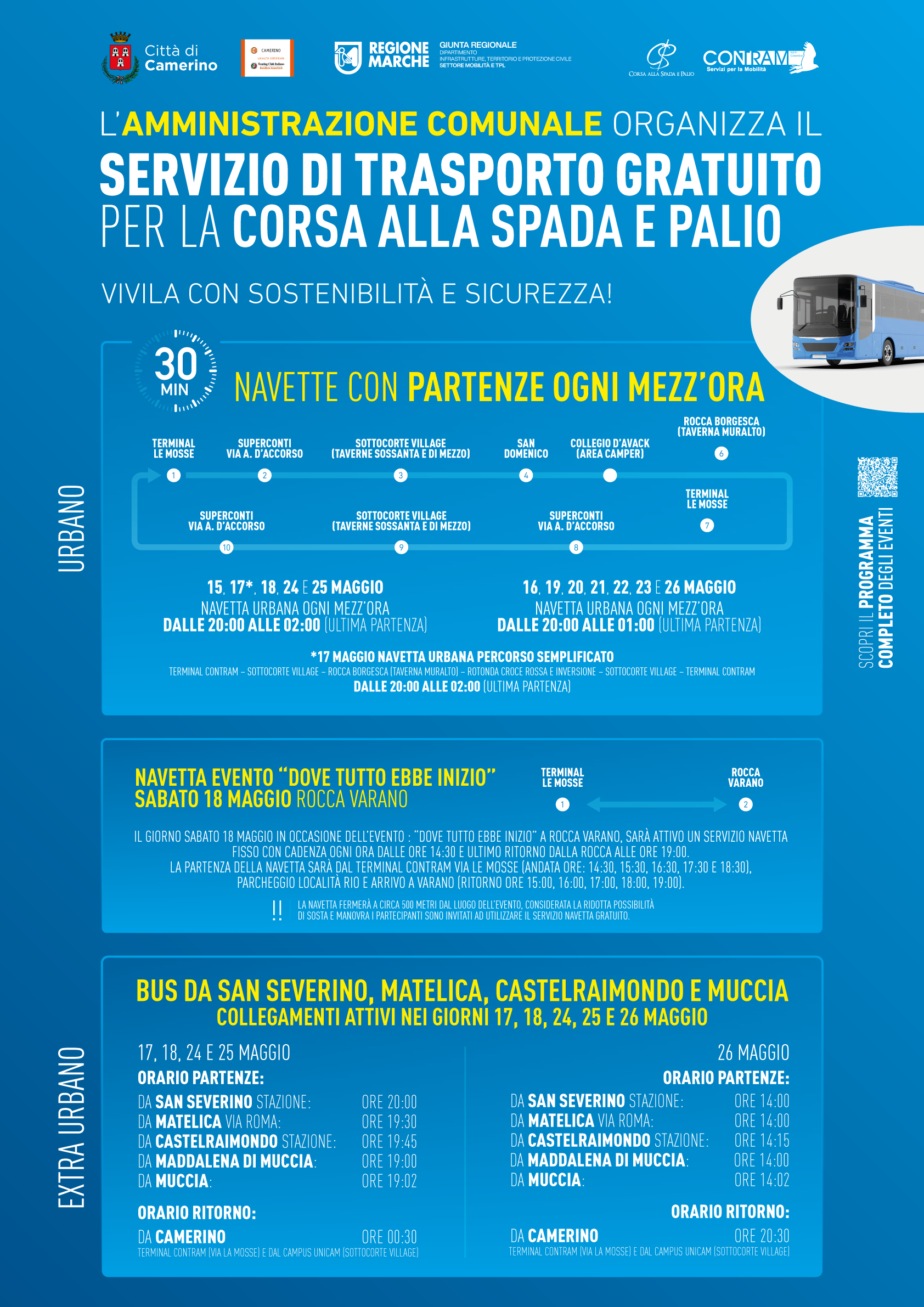 “Il Comune di Camerino ha vinto l’ennesimo bando da parte della Regione Marche – spiega il sindaco Roberto Lucarelli – Questa volta abbiamo voluto puntare sulla possibilità, soprattutto per i più giovani, di venire a Camerino a godersi gli eventi della Corsa alla Spada e Palio in completa sicurezza e tranquillità attraverso la messa a disposizione di un servizio gratuito di trasporto urbano ed extraurbano, che vada oltre al collegamento tra i luoghi della Città ma coinvolgendo anche altri Comuni del territorio. Un servizio messo a disposizione da parte dell’Amministrazione comunale grazie anche alla collaborazione della Contram, proprio in quell’ottica di tranquillità e di sicurezza per far vivere al meglio la nostra festa”.