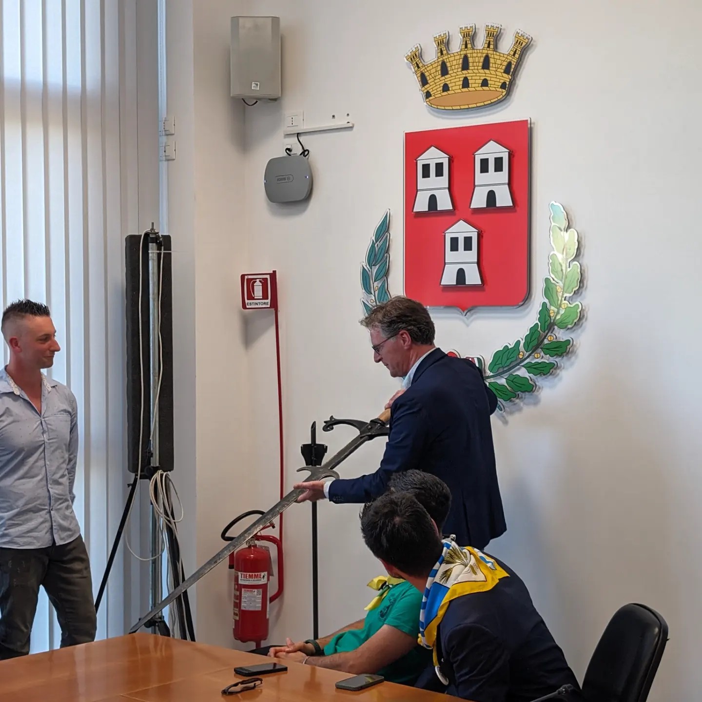 dell’Assessore allo sport di Fermo Alberto Maria Scarfini, del prorettore vicario Unicam Emanuele Tondi, del presidente del CUS Camerino Stefano Belardinelli e del presidente del Parco Nazionale dei Monti Sibillini Andrea Spaterna che, essendo il personaggio principale di questa rievocazione storica poiché sarà il Giulio Cesare da Varano del 2024, ha avuto l’onore di sguainare per primo la spada, un eccellente manufatto realizzato dal fabbro Riccardo Reversi di Muccia e donato dalla Pasta fresca da Luciana, sempre di Muccia.