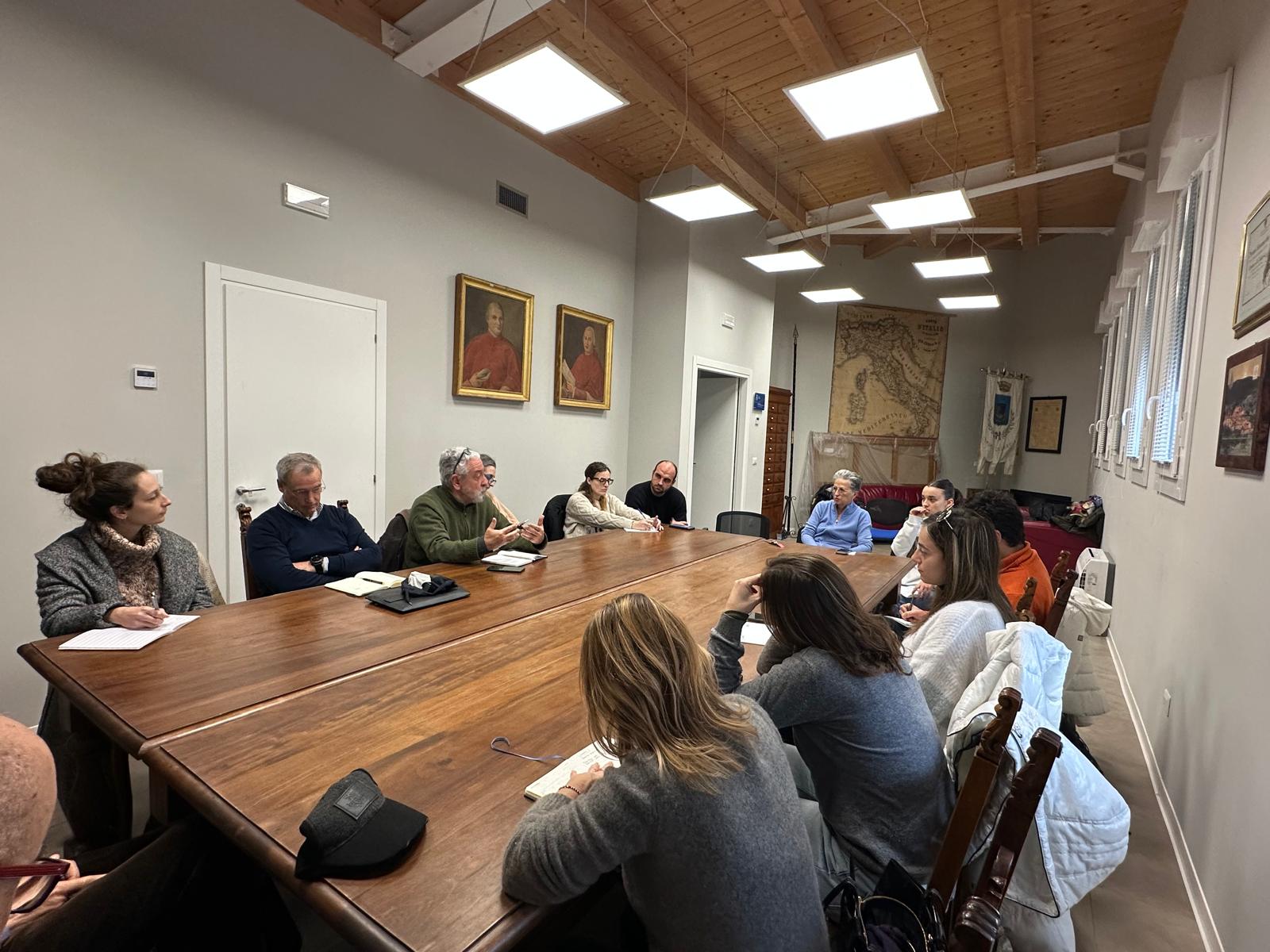 L’incontro è stato un momento di riflessione sulla necessità di fare rete tra enti, istituzioni e cittadini per restituire alla popolazione il valore storico, culturale e sociale dei luoghi in cui il sisma ha creato crepe non solo negli edifici, ma anche nelle comunità. L’obiettivo del Master è infatti quello di formare professionisti capaci di approcciare al tema della ricostruzione dal punto di vista multidisciplinare: antropologico, sociale, artistico, storico, strutturale, urbanistico e ambientale. Sorpresi i corsisti nel vedere come anche luoghi che all’apparenza sembrano desolati hanno in realtà vivacità territoriali inaspettate e di grande valore. «Purtroppo – ha sottolineato Calafati Claudi – su questo territorio si è lavorato, dopo il terremoto, con una serie di modelli tecnici che non hanno compreso né percepito la realtà disgregata e in dissoluzione che la comunità si trovava a vivere. Progettazioni, studi qualificati tecnicamente, ma poco aderenti alle esigenze sociali. Ci rende quindi felici sapere che questo Master abbia una dimensione multidisciplinare, perché  è arrivato il momento, o meglio è già tardi, per chiedersi cosa vogliamo fare dei beni storici e culturali di queste terre nell’attesa che tornino a essere agibili». Le ha fatto eco Francesco Calzolaio: «Vorremmo – ha detto – che i Comuni e il Commissario straordinario alla ricostruzione dedicassero una parte del loro operare al consolidamento della memoria dei luoghi colpiti dal sisma. Un ruolo fondamentale è quello che possono avere i musei qualora si riuscisse spostare l’attenzione dal loro valore estetico al potenziale valore d’uso». Grande apertura è stata mostrata da parte del sindaco, Giuseppe Fabbroni: «Se non uniamo le forze siamo destinati al degrado progressivo – ha sottolineato – poiché singolarmente non abbiamo la capacità di risollevare le comunità. È necessario cambiare rotta in un Paese come l’Italia che purtroppo è patria dell’individualismo. Noi siamo pronti a sostenere questo progetto». Sostegno arrivato anche da Maria Bocci, in rappresentanza del Rotaract Tolentino: «Vogliamo riflettere con voi su come possiamo contribuire alla rinascita dei territori colpiti dal sisma, coinvolgendo le comunità locali come quella di Vestignano. Con il Service distrettuale 2090 invitiamo i Club ad adottare un borgo per organizzare eventi e visite utili a valorizzare storie e tradizioni, e attualmente stiamo valutando l’idea di realizzare il progetto a Vestignano». La testimonianza di quanto si sta facendo a Caldarola è arrivata da Cristiana Machella, rappresentante del progetto Mappa di comunità: «Abbiamo iniziato nel 2021 – ha spiegato – sulla scia di una comunità disgregata come quella di Caldarola, fiaccata dal sisma e dal Covid. Senza una piazza da vivere abbiamo pensato che ci fosse la necessità di impegnarsi per recuperare la comunità e tramite l’Istituto storico di Macerata e i Cantieri mobili di Storia, che avevano già avviato progetti simili altrove. Abbiamo iniziato a recuperare la memoria del paese con il coinvolgimento di cittadini che hanno portato esperienze, racconti, diari e interviste. Abbiamo coinvolto i bambini della scuola che non conoscevano la Caldarola prima del sisma per far sì che la storia recente del nostro paese non venisse dimenticata». I corsisti sono stati accompagnati anche nella chiesa – inagibile dal 2016 – dei Santi Giorgio e Martino di Vestignano e al teatro comunale di Caldarola dove è stato visionato il docufilm prodotto con l’IIS Da Vinci di Civitanova proprio sulla comunità di Vestignano.