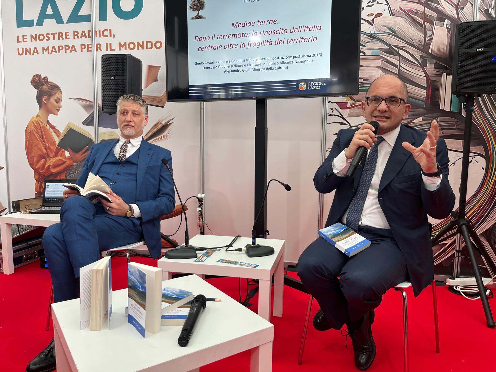 L’urgenza ineludibile della ricostruzione delle decine di migliaia di edifici crollati o lesionati dalla sequenza sismica 2016-2017 nel Centro Italia “ci ha fatto comprendere che c’è bisogno anche di una rigenerazione sociale, economica e culturale delle comunità coinvolte nella tragedia di otto anni fa” commenta Guido Castelli, Commissario straordinario alla ricostruzione sisma 2016, durante la presentazione del volume “Mediae Terrae. Dopo il terremoto: la rinascita dell’Italia centrale oltre la fragilità del territorio” (edito da Giubilei). L’anteprima del libro, dalla prossima settimana nelle librerie e sulle piattaforme online, si è svolta presso lo stand della Regione Lazio al Roma Convention Center, in occasione della Fiera Nazionale della Piccola e Media Editoria “Più libri, più liberi”, con il Ministro della Cultura Alessandro Giuli e l’editore Francesco Giubilei, Guido Castelli, Commissario Straordinario Sisma 2016.