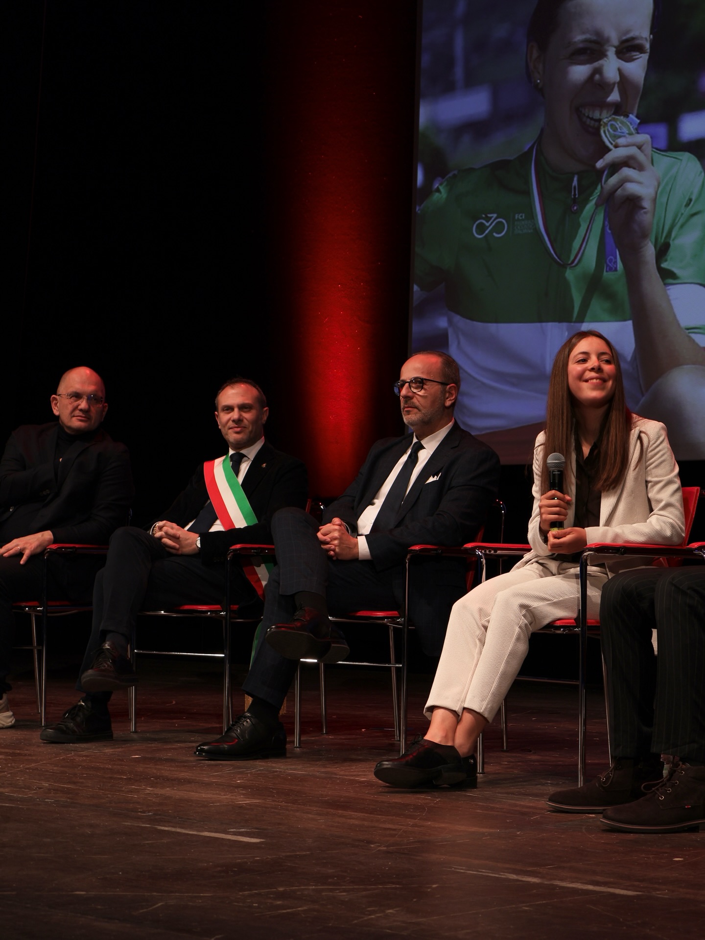 Accanto al sindaco Roberto Lucarelli e al giornalista Beppe Conti, ho avuto il piacere di incontrare due giovani promesse del ciclismo italiano, tra cui il camerte Giulio Pellizzari.