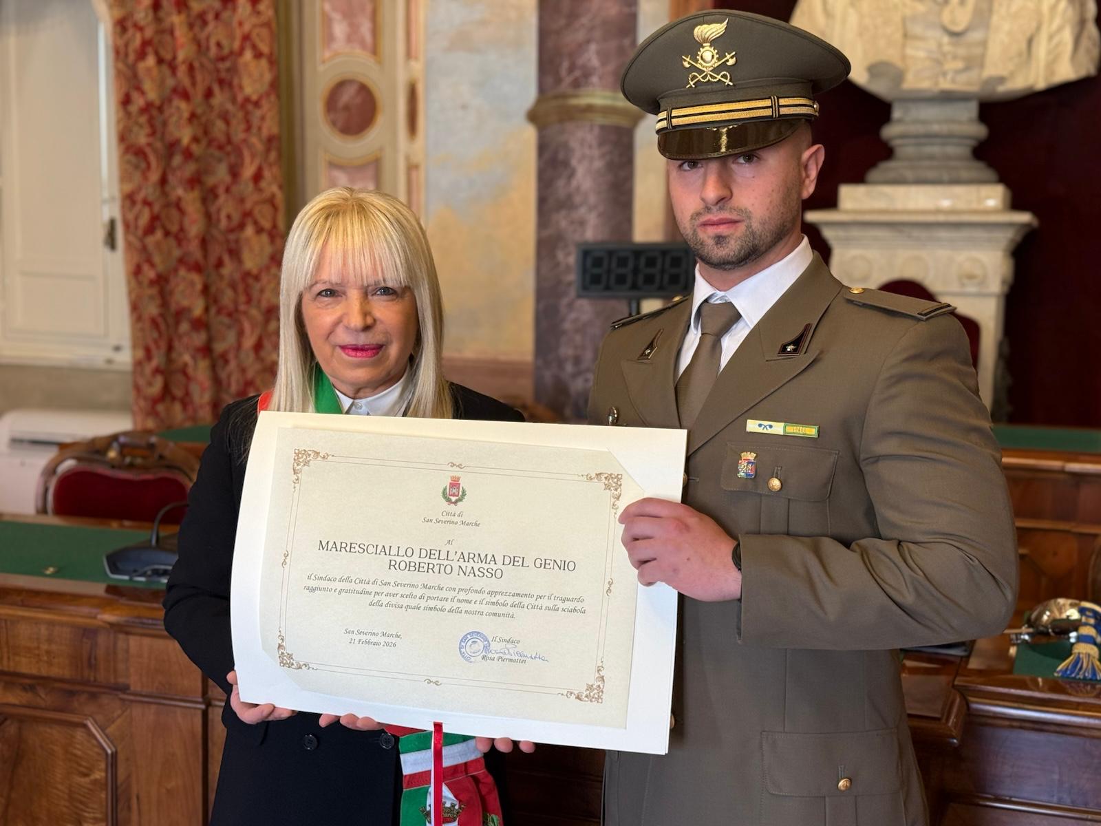 In una cornice di solennità e profonda emozione la Sala Consiliare del Palazzo Comunale ha ospitato la cerimonia di riconoscimento che la Città di San Severino Marche ha voluto dedicare al proprio concittadino Roberto Nasso, giovane figlio della terra settempedana che ha recentemente conseguito il grado di Maresciallo dell’Esercito Italiano.